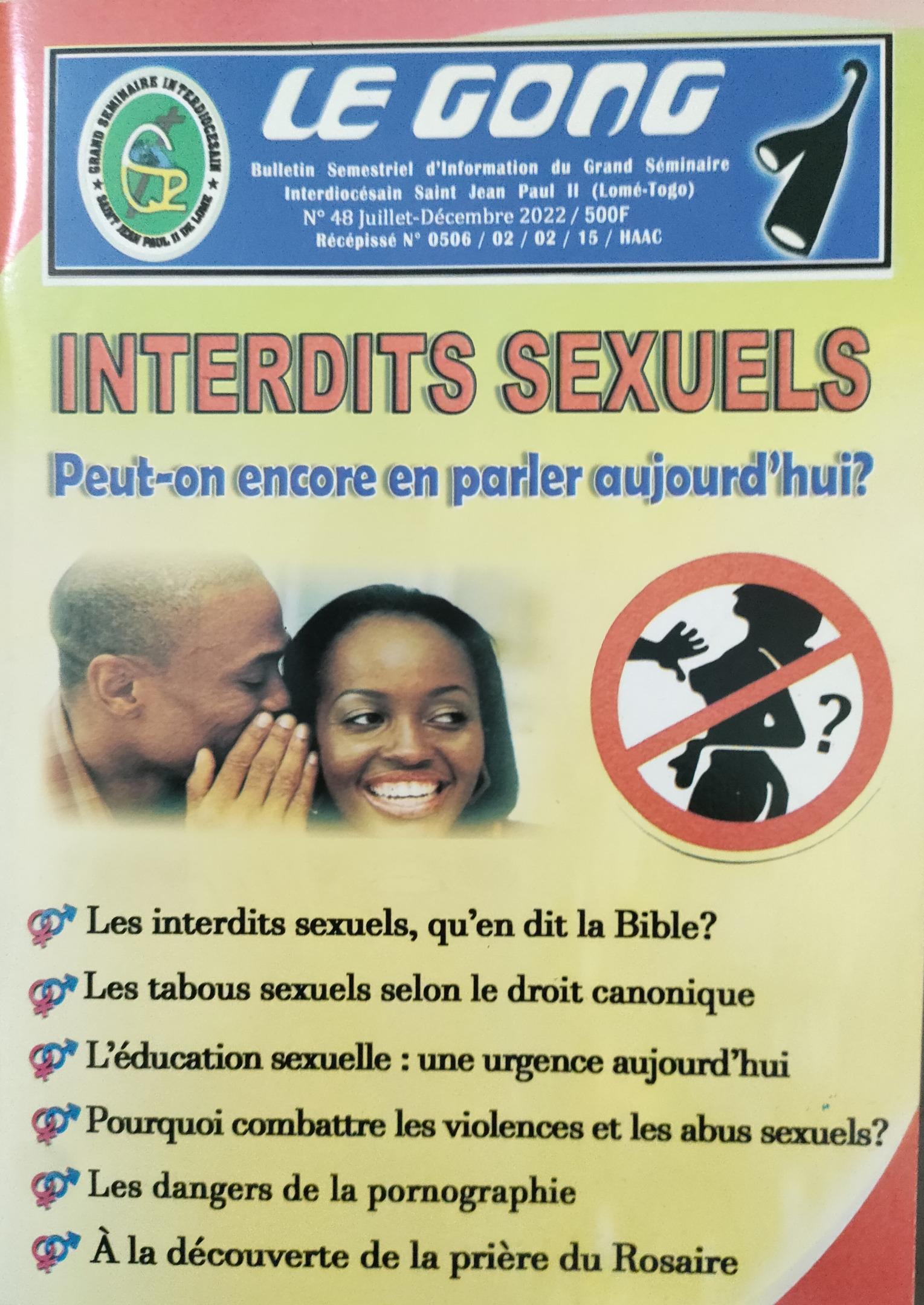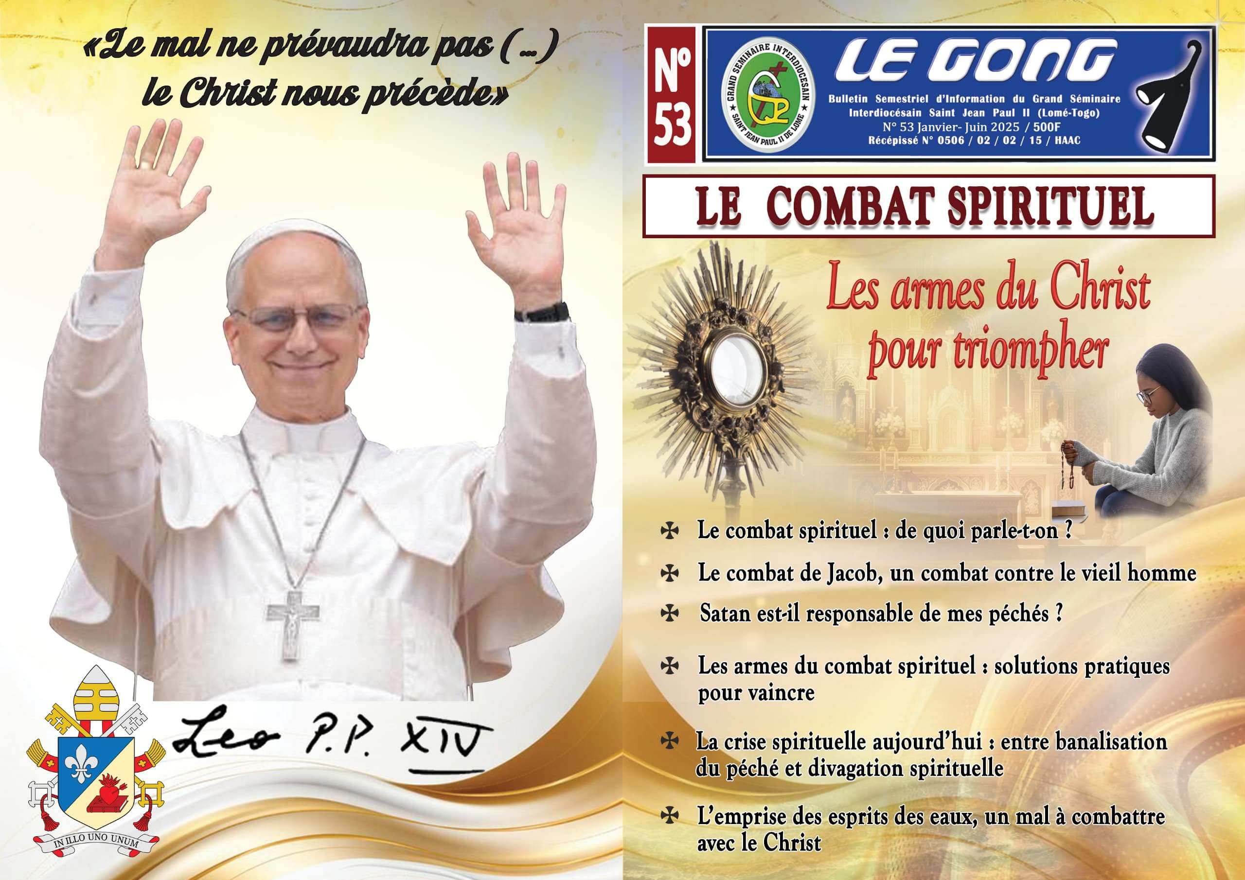 Ce numéro se penche également sur les 40 ans d’existence du Grand Séminaire Jean Paul devenu Grand Séminaire Interdiocésain saint Paul II de Lomé. Nous irons donc à la découverte de l'histoire de ses débuts et les richesses spirituelle et artistique de son oratoire.