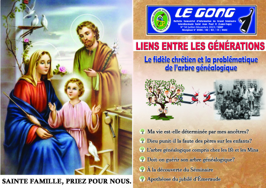 Ce 50e numéro du bulletin Le Gong cherche à répondre à ces questions. Pour ce faire, l’actuel numéro de notre bulletin aborde la problématique de l’arbre généalogique à partir des Saintes Écritures, de la Théologie Morale, des Sciences humaines, et de l’anthropologie culturelle africaine. Vous y trouverez également des articles sur l’histoire du Grand Séminaire dans le cadre de ses 40 ans d’existence, et sur la vie actuelle de notre maison de formation.